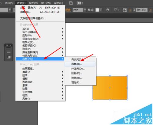 2、然后选中矩形图形到效果—风格化—圆角,如图所示