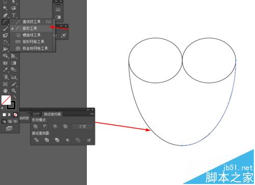 2、然后选择弧线工具,用弧线把两个椭圆连接起来,如图所示