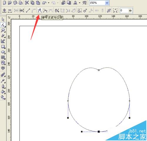 7、点击正圆下边的节点,再点击属性栏的“使节点成为尖突”的按键。