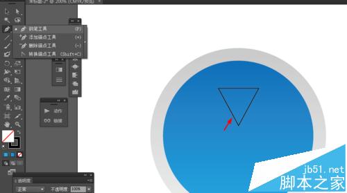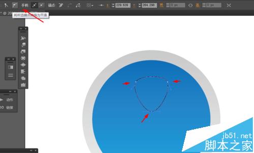 3、接着选择钢笔工具,勾出三角形的路径,再选择直接选择工具,把三角形的锚点变成平滑锚点,如图所示