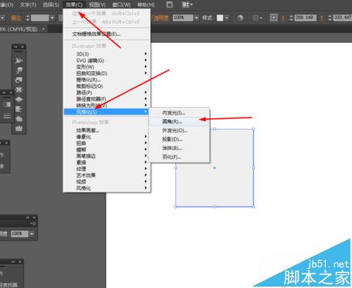 2、选中正方形到效果—风格化—圆角,如图所示