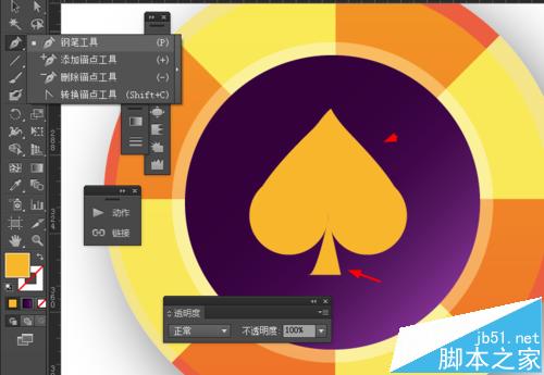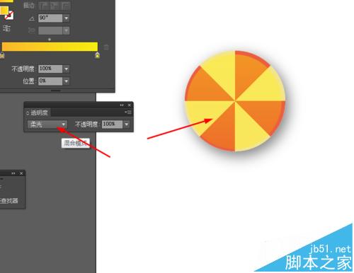 6、接着选择椭圆图形,画一个正圆图形,并添加渐变颜色,再到窗口—透明度—混合模式改为柔光,如图所示