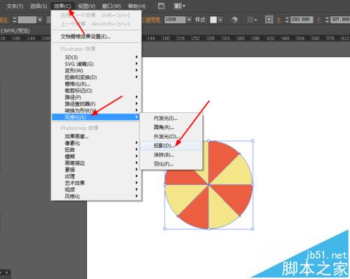 5、点击图形右键选择编组,再到效果—风格化—投影,如图所示