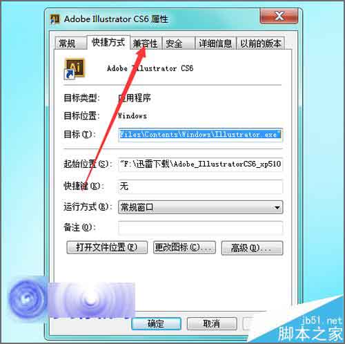 2、接着在打开的它的属性对话框之后,可以看到它默认的是选择的快捷方式 。我们需要在它的菜单上面选择兼容性。