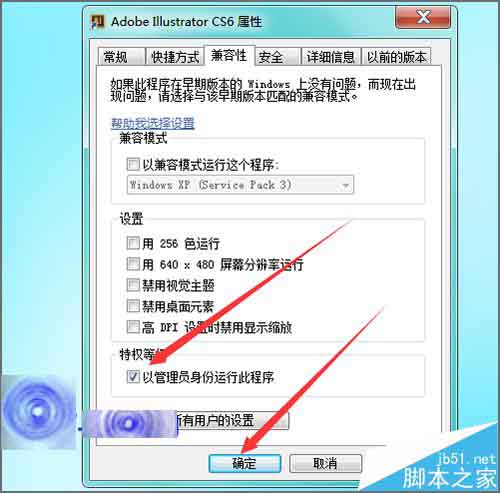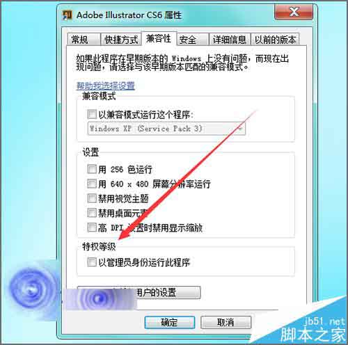 3、当我们点击兼容性之后,就可以看到在它的界面的最下方,有一个特权等级的文字。在它的下面有一个以管理员身份运行此程序。可以看到它前面是没有勾选的。我们可以在它的前面进行一个勾选。然后点击确定。