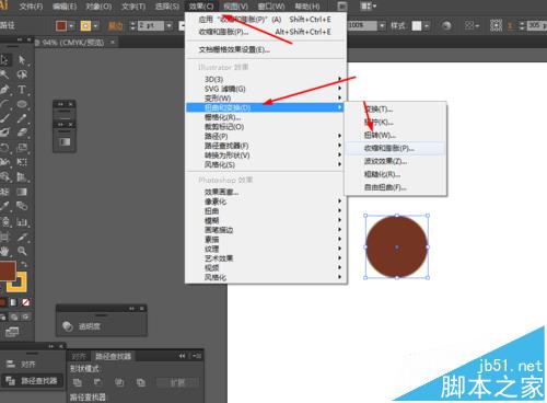 2、然后选择圆形到效果—扭曲和变换—收缩和膨胀,如图所示