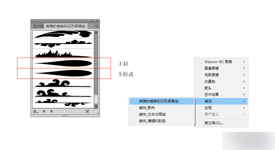 然后把我们即将要用的艺术画笔都调出来。打开"画笔"面板,在右上角的下拉选框中选择【打开画笔库>装饰>典雅的卷曲和花形画笔组】,在这一组艺术画笔中选择【上拉】和【下拉式】这两种画笔。大家可以从画笔的基本预览形态上看到这是画植物叶面的最佳选择。
