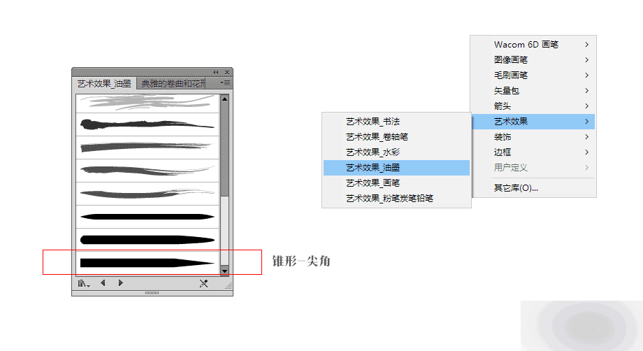 再从【艺术效果>油墨】中找到【锥形-尖角】。这是画植物的枝干时所需要用到的画笔。