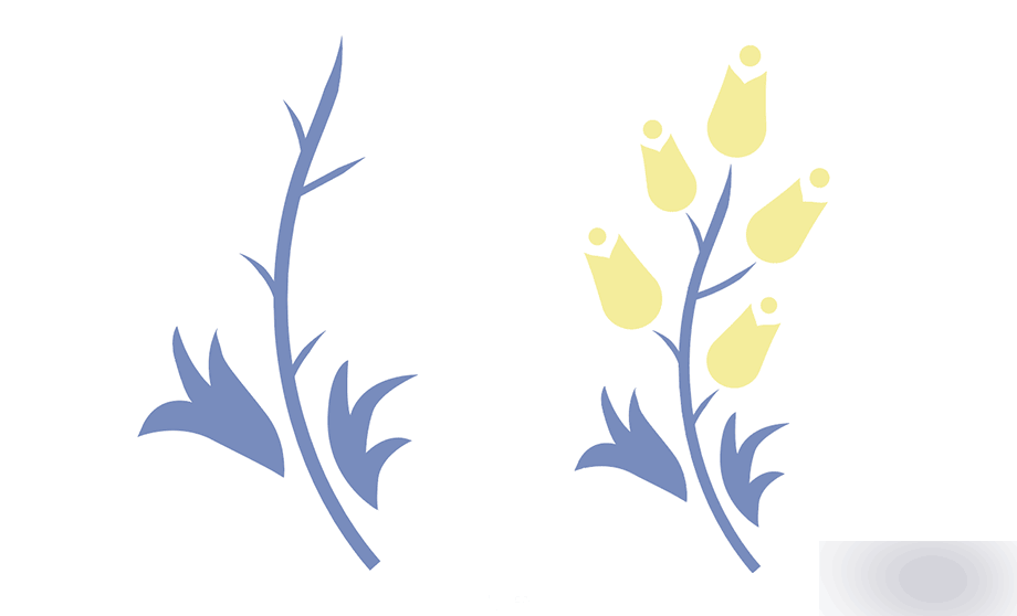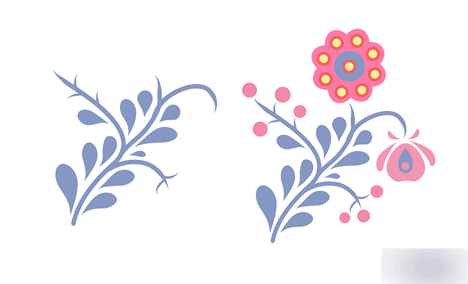 花朵的形状可以千差万别,但整体的风格要和谐一致,叶片的部分稍微做了一些变化,这里不仅可以用艺术画笔去绘制,还可以用钢笔工具来完成。