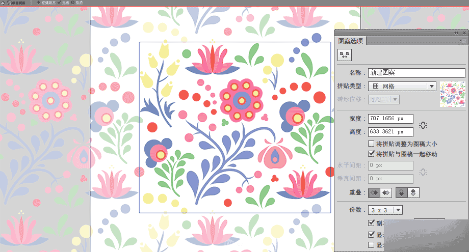 我喜欢在图案工具里操作,选中所有的图案,进入【对象>图案>建立】,这时蓝色框内的即是单元内的图案,而外围的部分则是根据这个单元内图案平铺而成的纹理图案,可以随时根据效果进行实时调整。