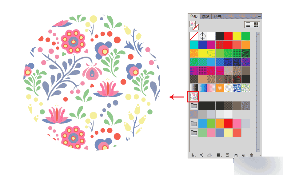 这时会在色板中看到你最新制作好的图案,当你双击这个图案的时候,又会进入到图案编辑,就像上一步那样,点击完成后保存新的修改。