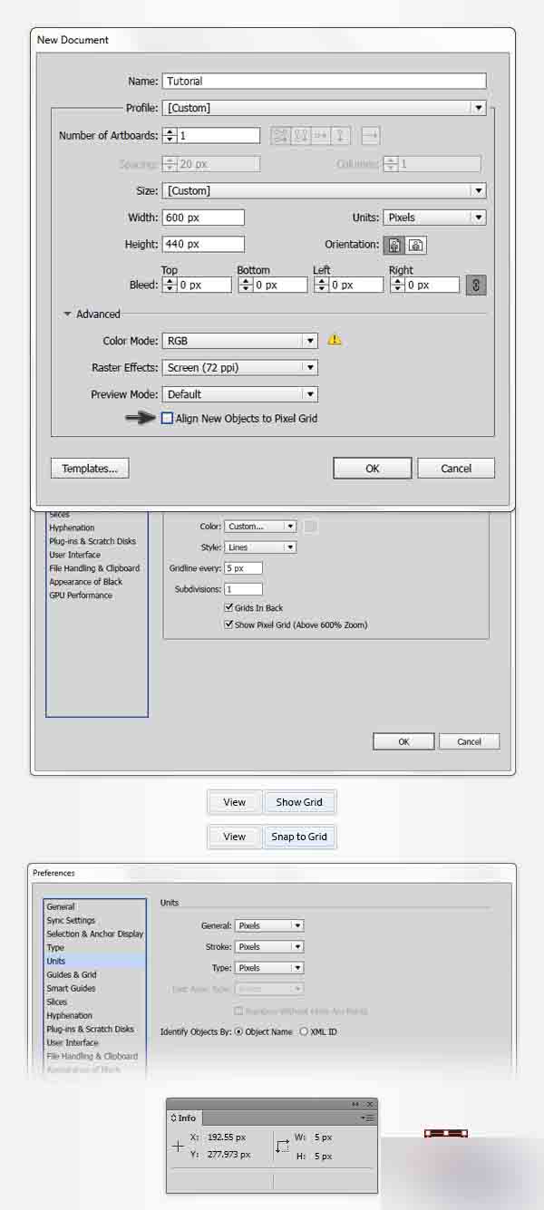 1. 创建一个新文档并设置网格点击 Control-N创建一个新文档。 从单位的下拉菜单中选择像素,在宽度框中输入600,在高度框中输入440,然后点击高级按钮。 选择RGB,屏幕(72ppi)并确保在点击确定之前使新建对象与像素网格对齐框未被勾上。