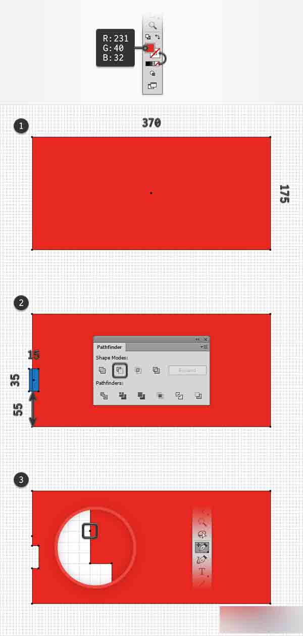 选择矩形工具(M)并注意到你的工具栏上。 移除描边的颜色,然后选择填充并设置它的颜色为R=231 G=40 B=32。 移动到你的画板上并创建一个 370 x 175 px的矩形——启用网格并对齐网格会使你的工作变得更容易。