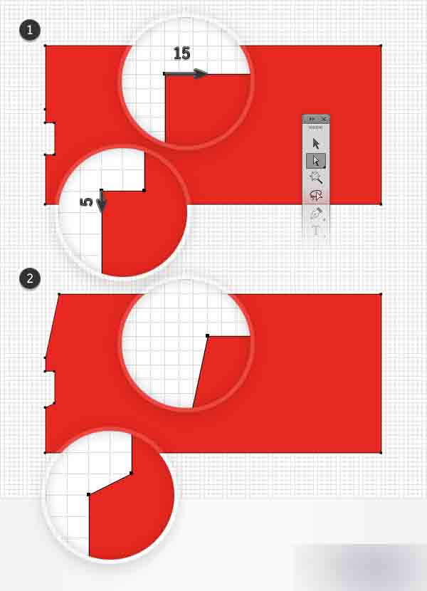 保持关注到你的形状的左边并选取直接选择工具(A)。 首先,选择顶部的锚点并将其向右拉动15px,然后选择其他高亮的锚点如下图所示向下拉动5px。 最终应该看起来像第二张图一样。