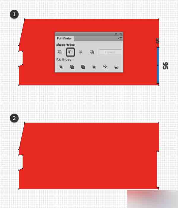 使用矩形工具(M),创建一个5 x 95 px的形状并将其准确放置到如第一张图所示的位置。 选择红色形状旁边的新矩形并从路径查找器面板中点击减去顶层按钮。
