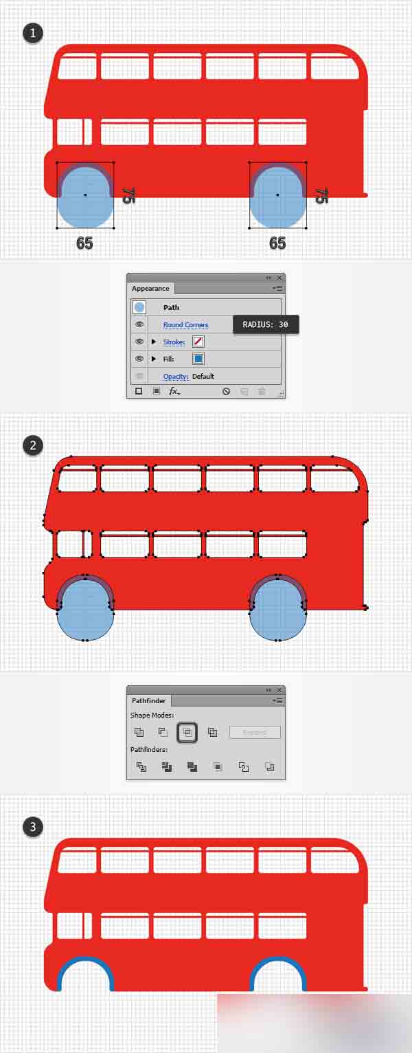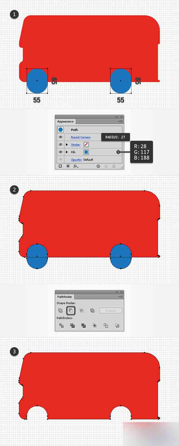 利用矩形工具(M),创建2个55 x 65 px的形状,选择任意蓝色作为填充色,然后将这些新形状放置在如第一张图所示的位置。 选择2个矩形并转到效果>风格化>圆角。 输入27px半径,点击确定按钮,然后转到对象>扩展外观。 确保生成的形状被选中并使用Control-8快捷键(或转到对象>复合路径>建立)将它们转化成一个简单的复合路径。 选择它以及你的红色图形并从路径查找器面板中点击减去顶层按钮。