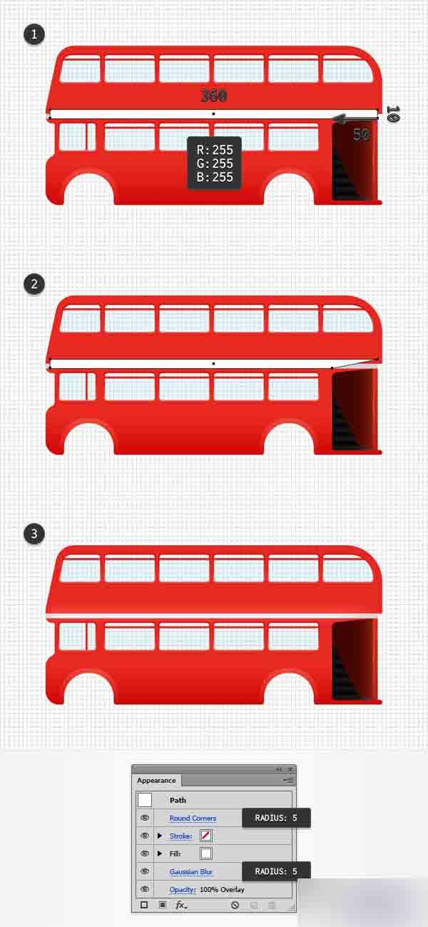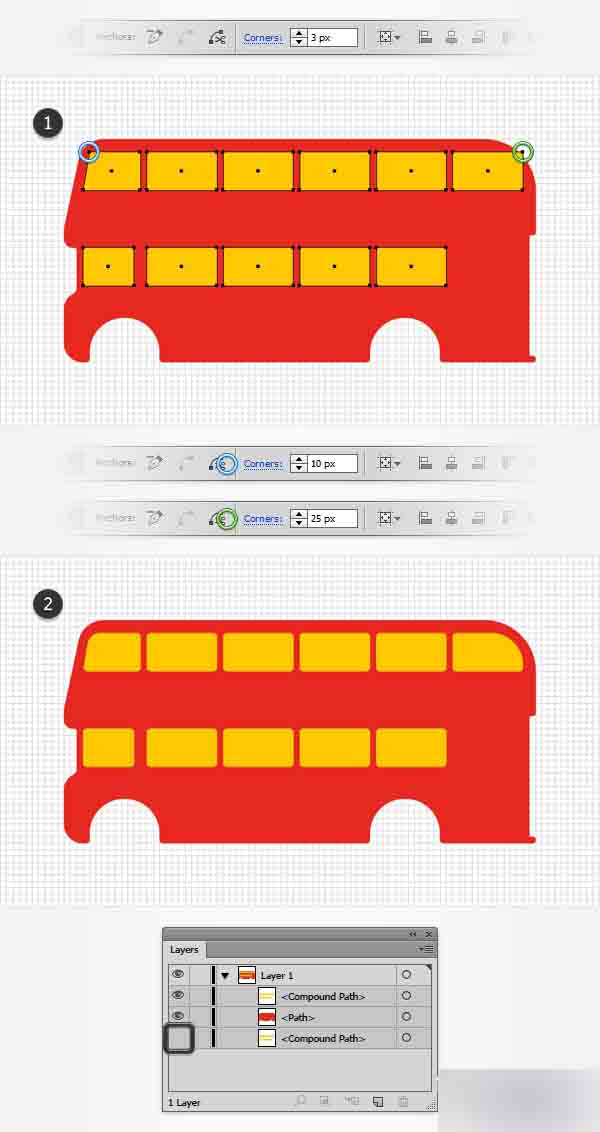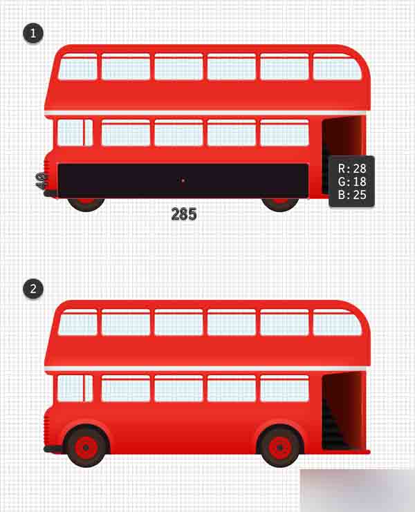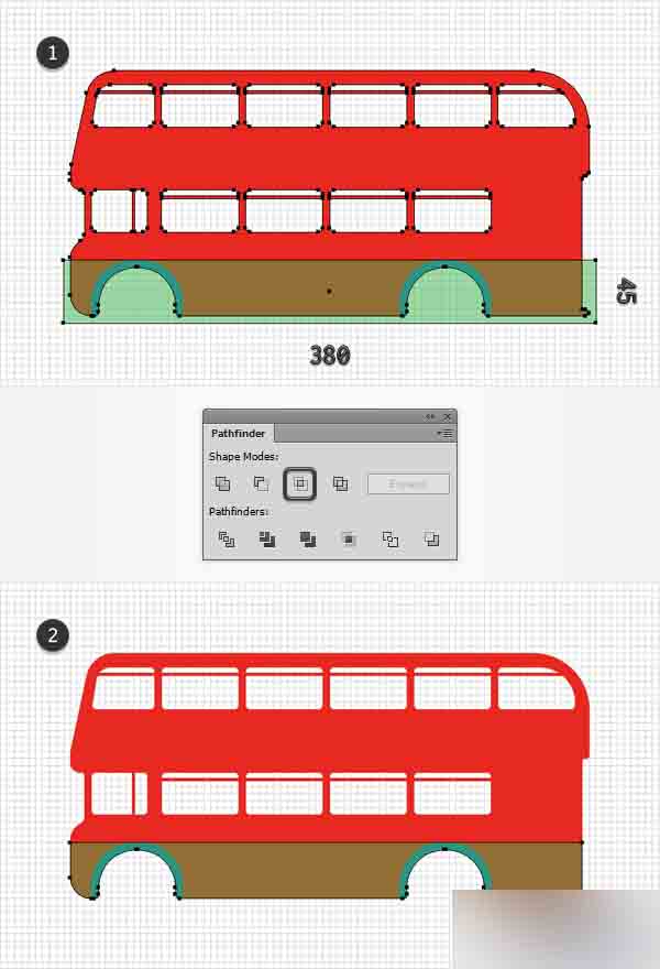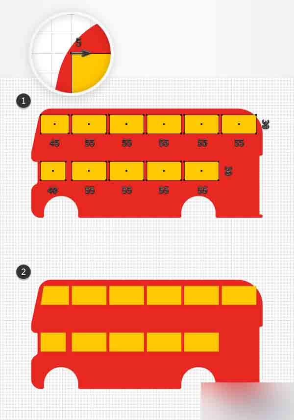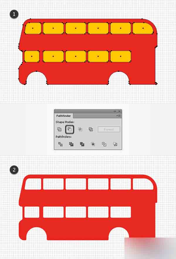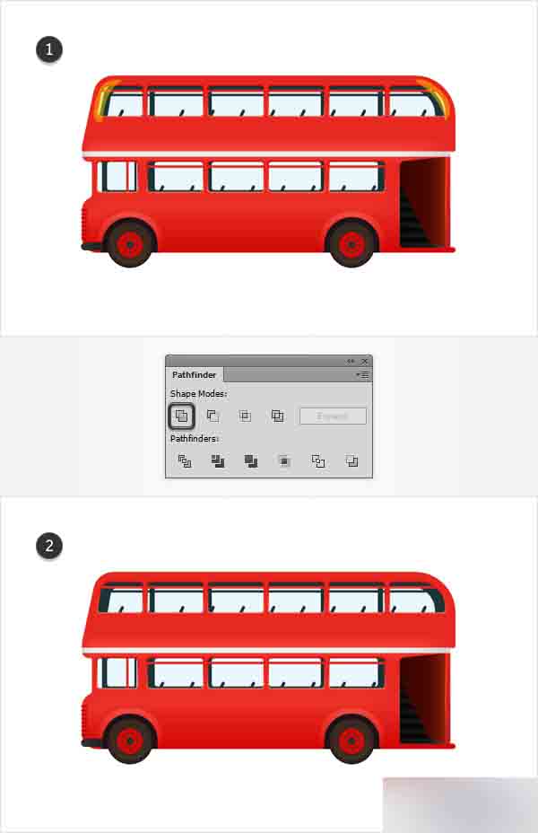 利用钢笔工具(P),创建2条简单路径覆盖住顶部的小间隙以组成你的巴士的内部。 只需简单的将这些形状与主要形状合并,最终的结果应该看起来像第二张图。
