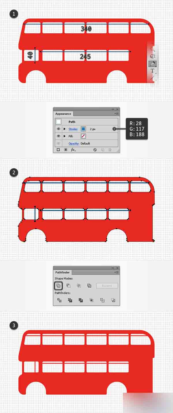 使用钢笔工具(P),创建一个40px的垂直路径,一个340px的水平路径和一个245px的水平路径。 为这些路径添加2px的蓝色描边,并将其置于第一张图所示的位置。 确保3个路径都被选中,然后转到对象>路径>轮廓描边。 选择生成的形状和红色的形状,并从路径查找器面板中点击合并按钮。
