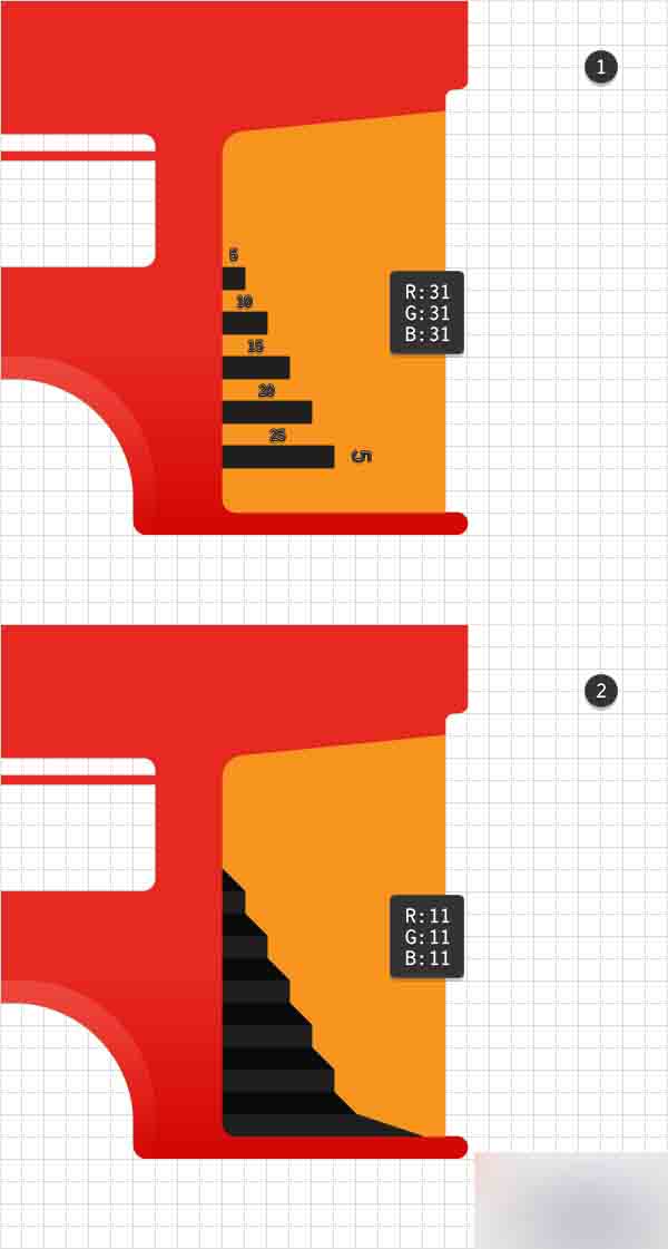 利用矩形工具(M),创建一组如第一张图所示的小矩形,并使用R=31 G=31 B=31作为填充颜色。 转到钢笔工具(P),创造一直如第二张图所示的形状并使用R=11 G=11 B=11作为填充色。