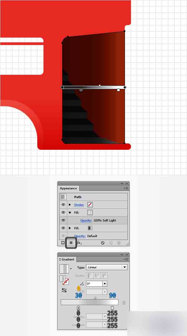 确保背景图形被选中,关注到外观面板并添加第二个填充。 选中它,改变混合模式为柔光并用下图所示的线性渐变替换现存的颜色。