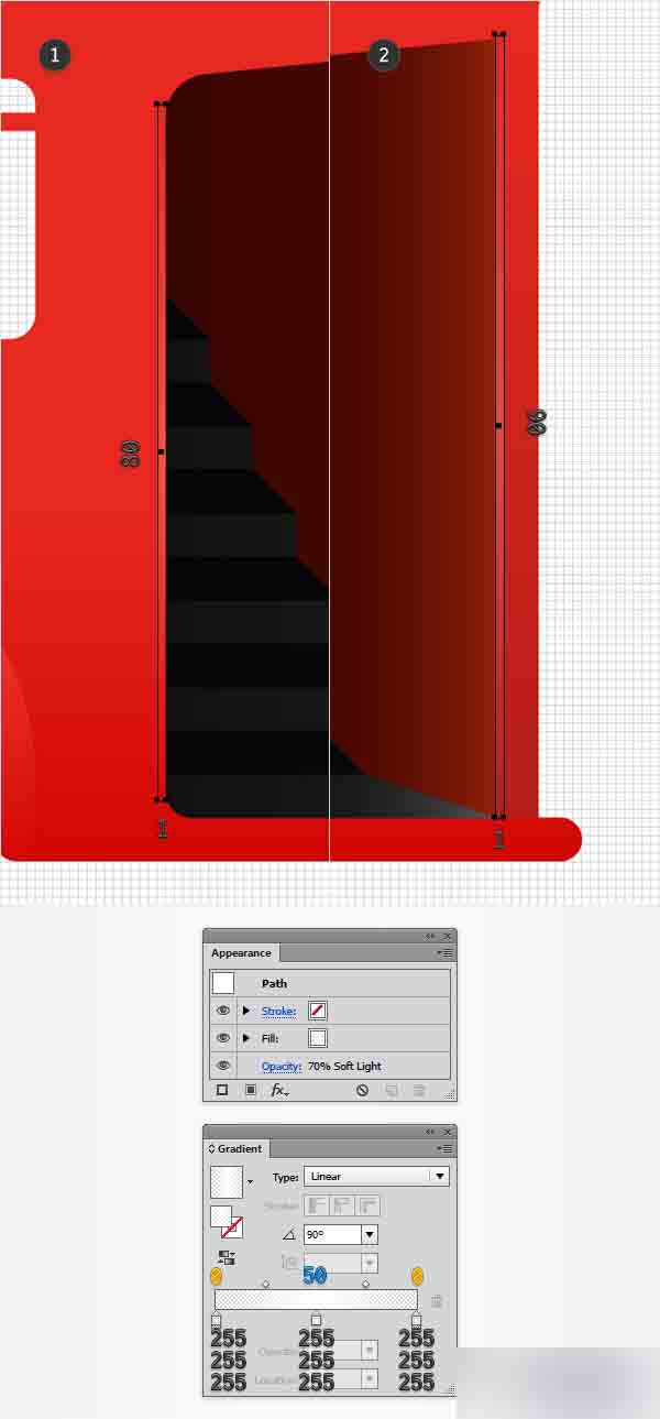 制作一份酒红色形状的拷贝 (Control-C > Control-F)并将其置于顶层(Shift-Control-])。 确保其被选中并专注到外观面板上。 选择现存的填色,降低透明度为50%,改变混合模式为柔光并用下图所示的线性渐变替换现存的颜色。