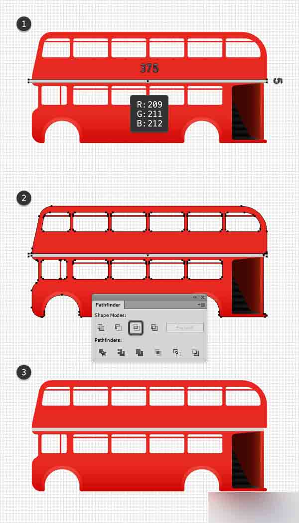 确保你的红色复合路径被选中并在它的顶层制作一份拷贝(Control-C > Control-F)。 使用矩形工具(M),创建一个 375 x 5 px的形状,设置填充色为 R=209 G=211 B=212并放置到如用下面第一张图所示的样子。 选择这个新矩形和你的红色图形的拷贝,并点击路径查找器面板中的交叉按钮。