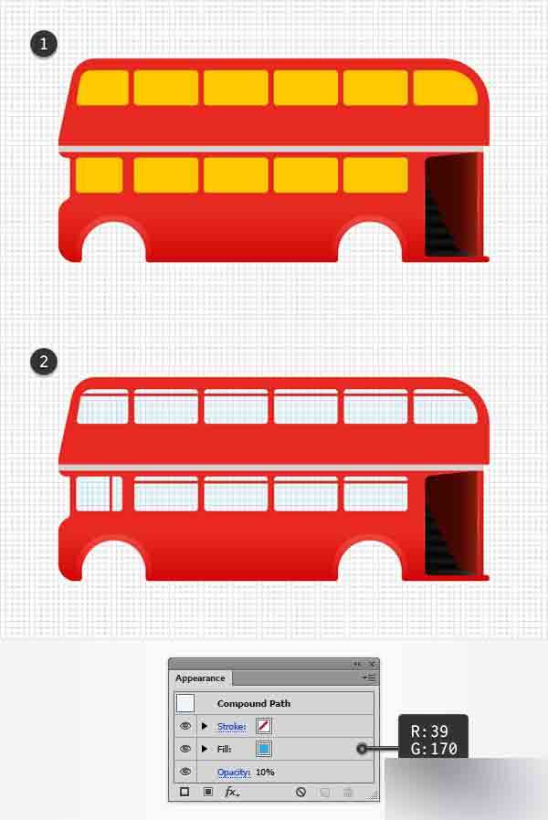 关注你的图层面板的底部并打开黄色路径的可见性。 选中它并专注到外观面板。 降低透明度到10%并用R=39 G=170 B=225替换现存的颜色。