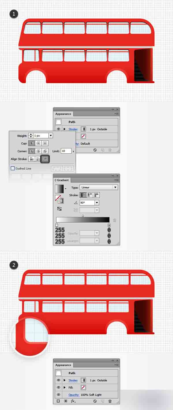 首先,增加透明度到100%并移除填充色。 接下来,选择描边,使其宽度为1px,用下图所示的线性渐变替换扁平的颜色,然后打开描边对话框并勾上对齐描边到外面的按钮。 最后,回到外观面板并改变混合模式为柔光。 最终你应该有一个如在第二张图中看到的精致的边框在窗子的周围。