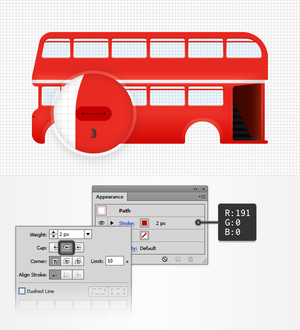 使用钢笔工具(P),创建一个3px的水平路径并大致的放在如下图所示. 给这个小路径添加2px的描边,设置颜色为R=191 G=0 B=0,并在弹出的描边面板中勾上圆端点按钮。