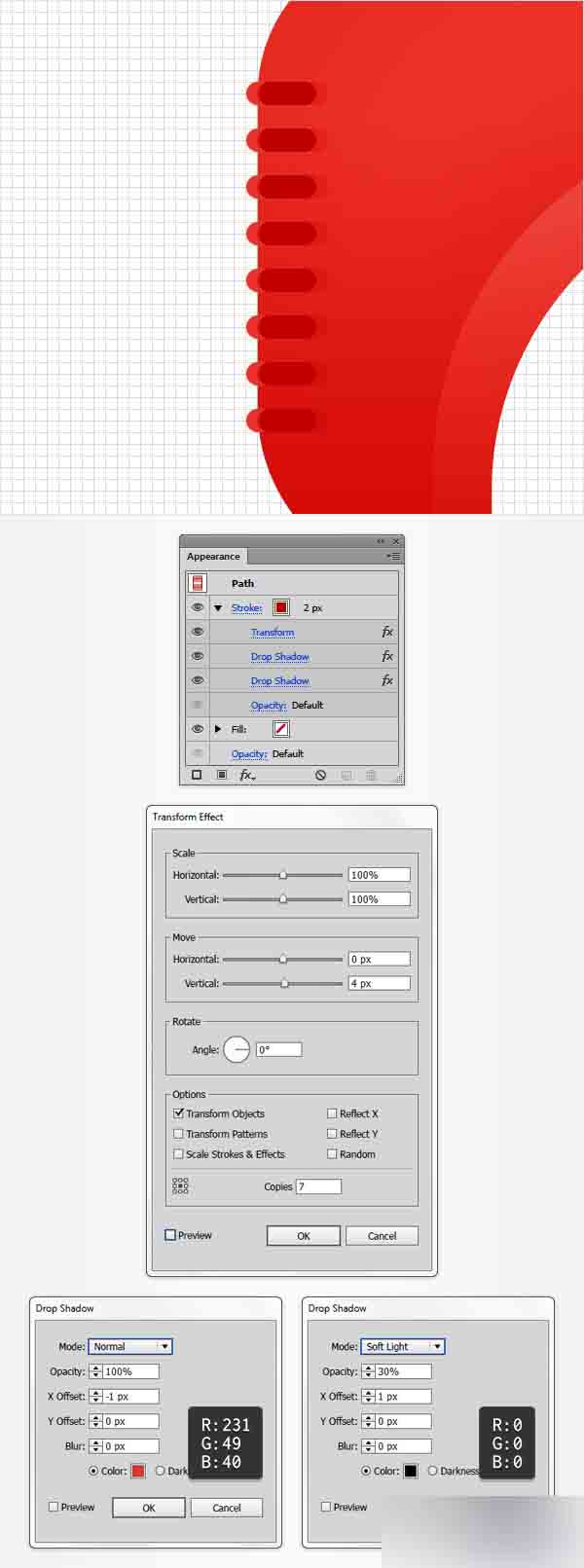确保你的小路径一直被选中,并转到效果>扭曲&变换>变换。 拖动垂直移动的滑块到4px,在复本框中输入7,点击确定按钮并转到效果>风格化>投影。 输入左边窗口显示的属性(在下面的图中),点击确定按钮然后转到效果>风格化>投影。 输入在右边窗口所显示的属性,然后点击确定。