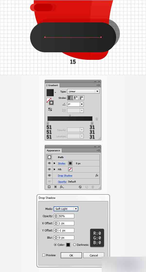 使用钢笔工具(P),创建一个15px水平路径并大致的将其放置在如第一张图所示的位置。 为这个新路径添加8 px描边,并用下图所示的线性渐变替换扁平的颜色,不要忘记在弹出的描边面板勾上圆形端点按钮。 然后转到效果>风格化>投影。 输入下图所示的属性并点击确定按钮。