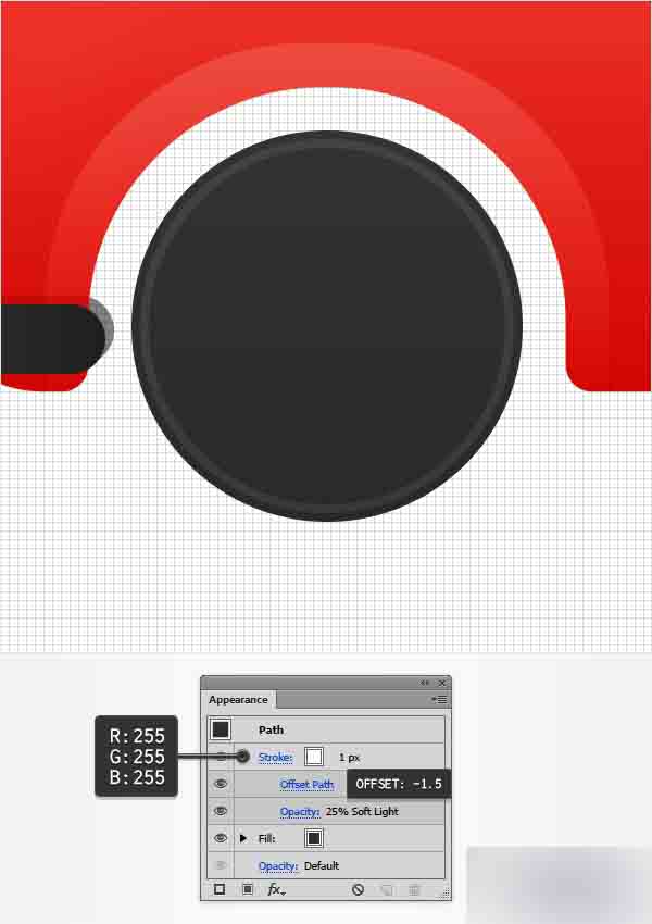 确保你的圆被选中,然后转到外观面板。 选择描边,使其为白色,降低其透明度为 25%,改变混合模式为柔光然后转到效果>路径>偏移路径。 输入-1.5px的偏移量然后点击确定按钮。