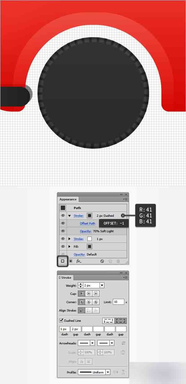 选择新的描边,设置它的颜色为R=41 G=41 B=41,然后打开描边弹出面板。 首先,增加宽度到2px,然后将虚线框勾上。 在第一个虚线框中输入1并在第一个间隙中输入2px,然后回到外观面板。 确保这一步添加的描边一直被选中,降低透明度到70%,并改变混合模式为柔光。