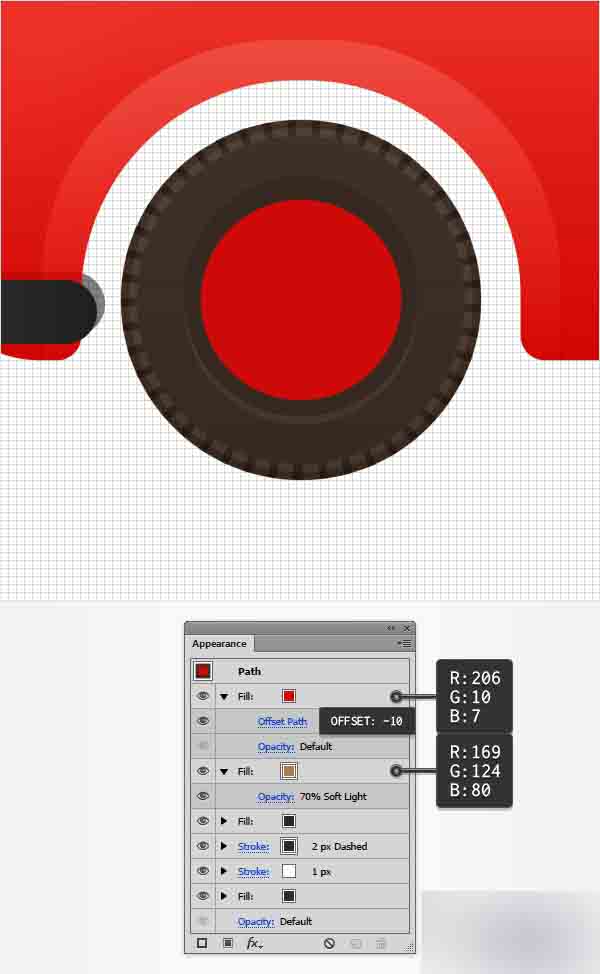 添加新填色并将其拉动面板的顶部。 设置其颜色为 R=206 G=10 B=7,然后转到效果>路径>偏移路径。 输入-10px的偏移量并点击确定。