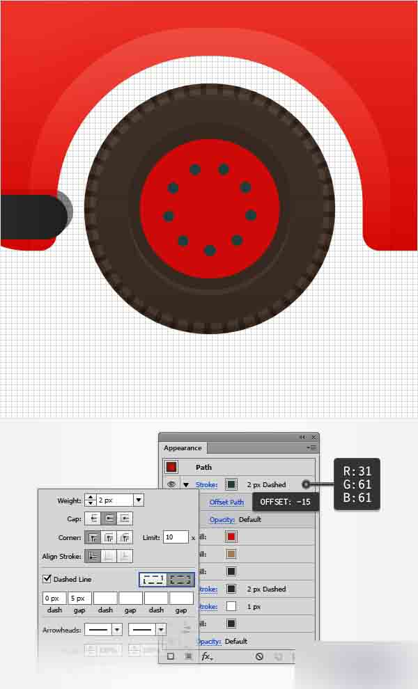 设置颜色为R=31 G=61 B=61,然后打开描边弹出的面板。 增加宽度为2px,将圆端点按钮和虚线框勾上。 在第一个虚线框中输入0px,第一个间隙框中输入5 px,然后回到外观面板。 确保在这步添加的描边被选中,然后转到效果>路径>偏移路径。 输入-15px的偏移量然后点击确定。