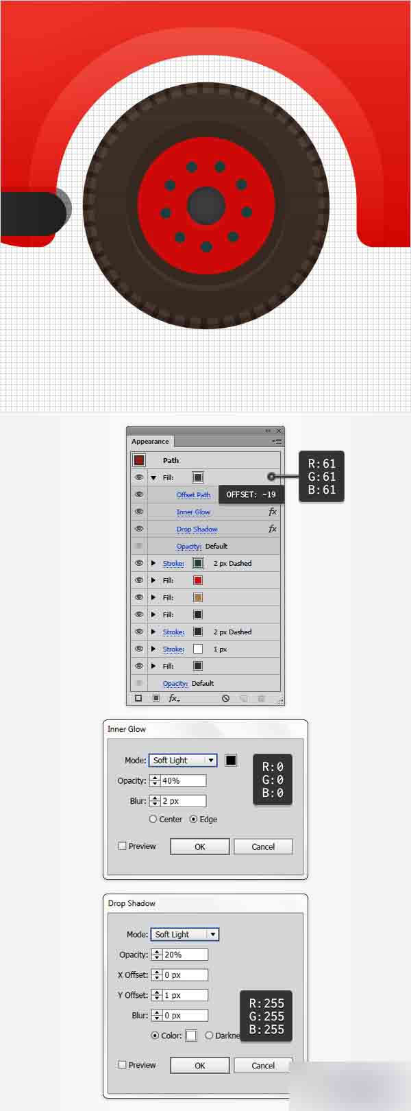 设置其颜色为 R=61 G=61 B=61然后转到效果>路径>偏移路径。 输入-19px的偏移量,点击确定按钮然后转到效果>风格化>内发光。 输入下图所示的属性,点击确定然后转到效果>风格化>投影。 输入如下图所示的属性然后点击确定按钮。