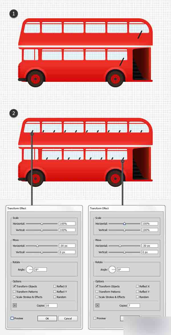 移动底部的倾斜路径,转到效果>扭曲&变换>变换。 再一次拖动水平移动滑块到-30px,在复本框中输入7并点击确定。