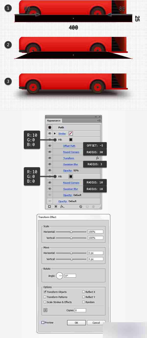 添加第二个填色,确保其颜色设为R=10 G=0 B=0,降低透明度到10%然后转到效果>路径>偏移路径。 输入-5px的半径,点击确定按钮,然后转到效果>风格化>圆角。 输入30px半径,点击确定并转到效果>扭曲&变换>变换。 输入下面所示的属性,点击确定按钮并转到效果>模糊>高斯模糊。 输入3px的半径并点击确定。