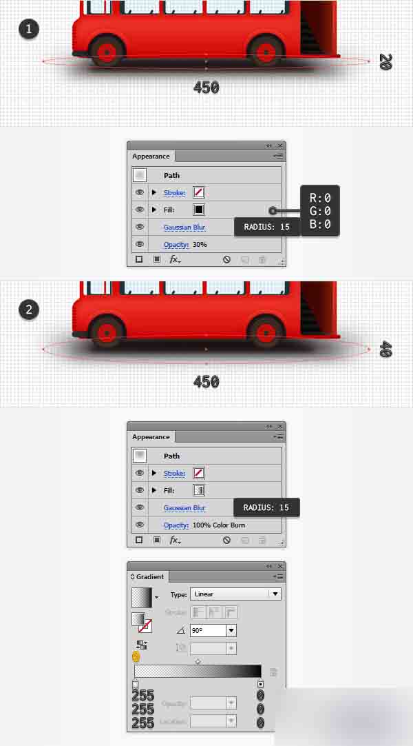 利用椭圆工具(L),创建一个450 x 20 px的形状并将其放置到如第一张图所示。 设置填色为黑,将其置于底层 (Shift-Control-[)然后关注到外观面板。 降低透明度到30%并转到效果>模糊>高斯模糊。 输入15px的半径并点击确定。