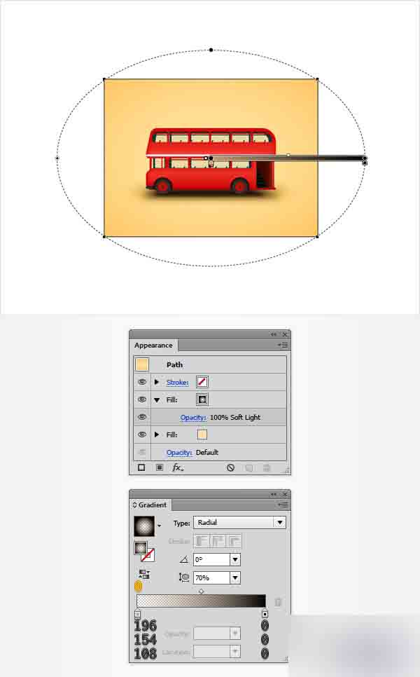 重新选择蓝色的复合路径并聚焦到外观面板上。 改变混合模式为柔光,然后用下图所示的线性渐变替换蓝色,记住在黄色的数字代表透明度的百分比。