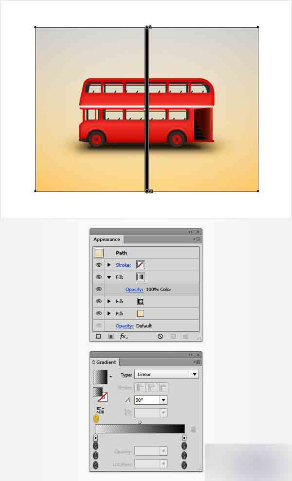 确保上一步的形状一直被选中,专注到外观面板上并使用添加新填色按钮添加第二个填色。 选择新的填色,改变它的混合模式为柔光并用下面图所示的样子替换线性渐变。 不要忘记在渐变的图中黄色的0代表透明度的百分比,而蓝色的数字代表位置的百分比。