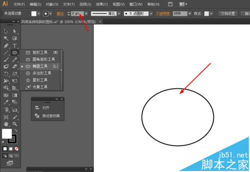 1、在Ai软件中,新建一个800*800的文档,选择椭圆工具,画一个椭圆图形,并描边改为3pt,如图所示