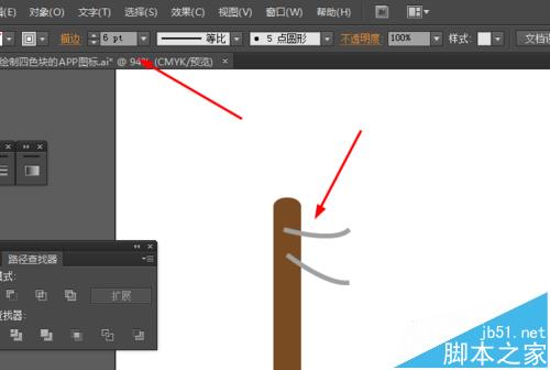 2、然后选择钢笔工具,勾出两条路径,描边改为6pt,如图所示