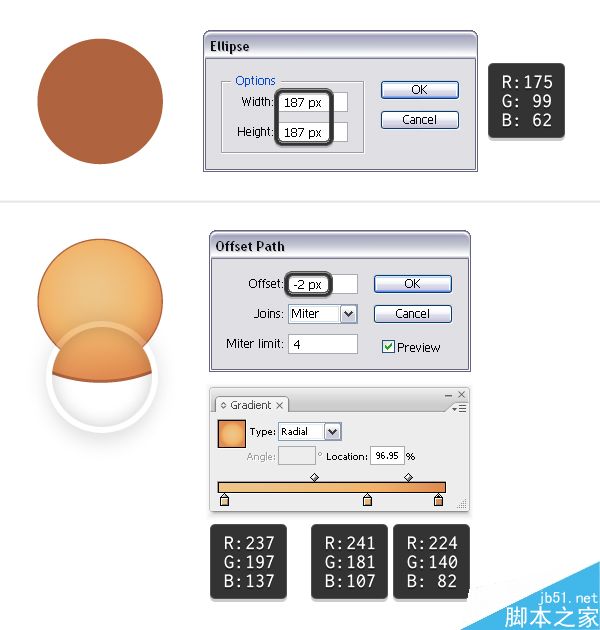 首先,抓取椭圆工具(L),并画一个187 x 187px的椭圆,并选择暖棕色作为填充色。 保持圆一直被选中,转到对象>路径>偏移路径,为了得到一个稍微小点的形状应用-2 px的偏移值。 用径向渐变填充新形成的圆,并使用渐变工具(G)调整方向。