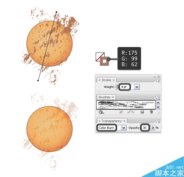 添加一些材质到甜甜圈上,选取钢笔工具(P)并如下图所示画一条直线路径。 然后用一个名为粉笔的艺术画笔描边,这个画笔从画笔库菜单>艺术效果>艺术效果>粉笔炭笔铅笔中选取。 增加描边宽度为4pt并改变颜色为暖棕色。 然后选择混合模式色彩加深以及30%的透明度。 保持画笔描边为现在的样子,我们随后将添加蒙板。
