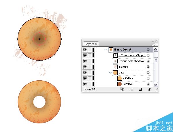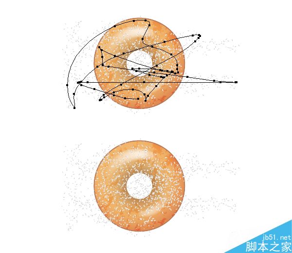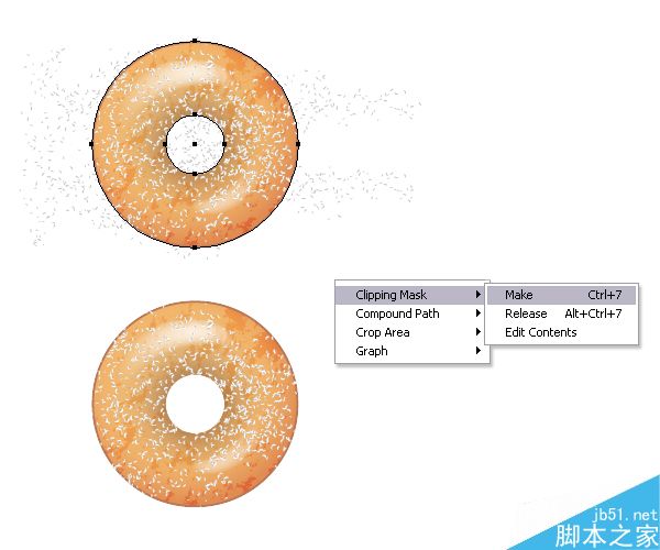 在这一步,我们应该清除额外的甜甜圈撒子,但是这次它们太多了,因此我决定使用遮罩代替。 抓取复合路径的一份拷贝,这是你之前使用作为基本甜甜圈的遮罩,确保这个形状在所有形状的前面,然后转到对象>排列>置于顶层(Shift-Control-])。 现在,选择2个描边路径和复合路径(无填充,无描边),并转到对象>剪切蒙板>建立(Control-7)。