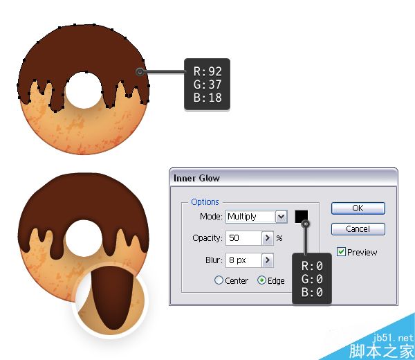 从糖衣巧克力片甜甜圈中"基本甜甜圈"以及糖衣和"2个高光形状",然后将它们复制和粘贴 (Control-V) 在你的画板上。 当糖衣形状被选择时,改变它的填充色为浅粉色,打开内发光窗口,并用这个效果改变颜色。 对2个"高光形状",增加羽化半径到9 px。 保持其他的部分相同。