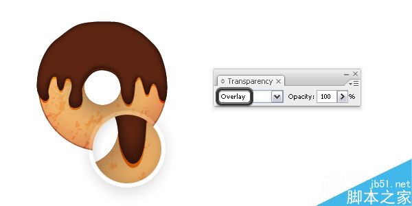 复制并粘贴在巧克力形状的后面(Control-B),然后按下你的键盘上的下箭头键3次将它向下移动3 px。 保持现有的外观并设置混合模式为叠加,然后你将会得到阴影。