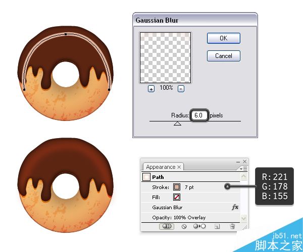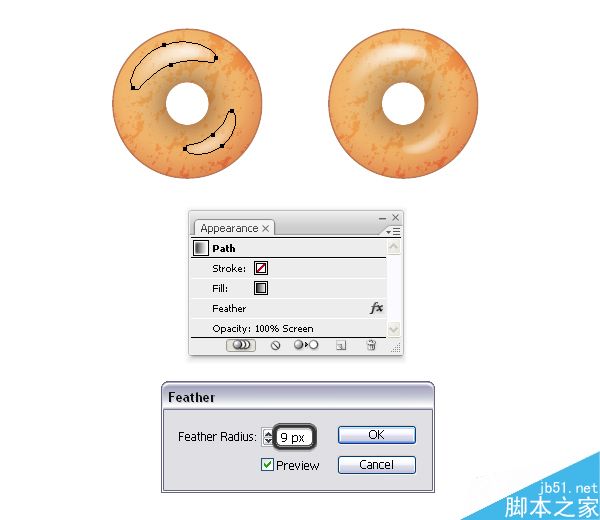 从糖衣巧克力甜甜圈中选择基本甜甜圈的编组和2个"高光形状",然后复制并粘贴 (Control-V) 到你的画板上。 将2个高光形状保持相同的外观,但增加羽化半径从5 px 到9 px。