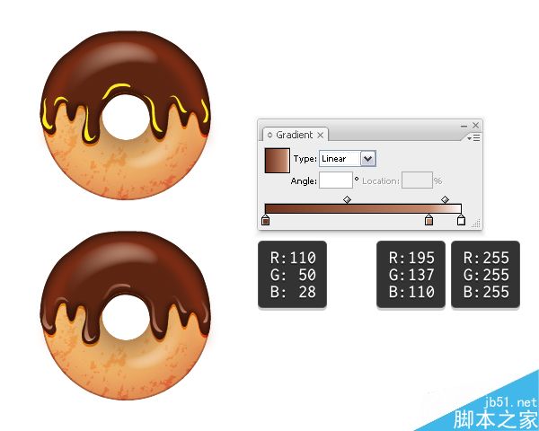 接下来,抓取钢笔工具(P)或者铅笔工具(N)并画几个如下面所示的类似水滴形状的巧克力。 在你完成之后,用下面所示的线性渐变填充。